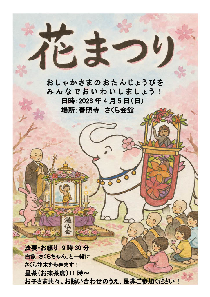 「はなまつり」とは、お釈迦様(しゃかさま)のお誕生日(4月8日)をご縁に、仏様との出遇いを喜ぶ行事です。お釈迦様のお母様は、お釈迦様をお生みになる前に白い象が胎内(たいない)へ入る様子を夢で見たといいます。また、お釈迦様ご生誕の際、空から甘露(かんろ)の雨が降りそそいだと伝えられており、これに、ちなんで「はなまつり」では花(はな)御堂(みどう)の誕生仏(お釈迦様)に甘茶(あまちゃ)をそそいでお祝いします。